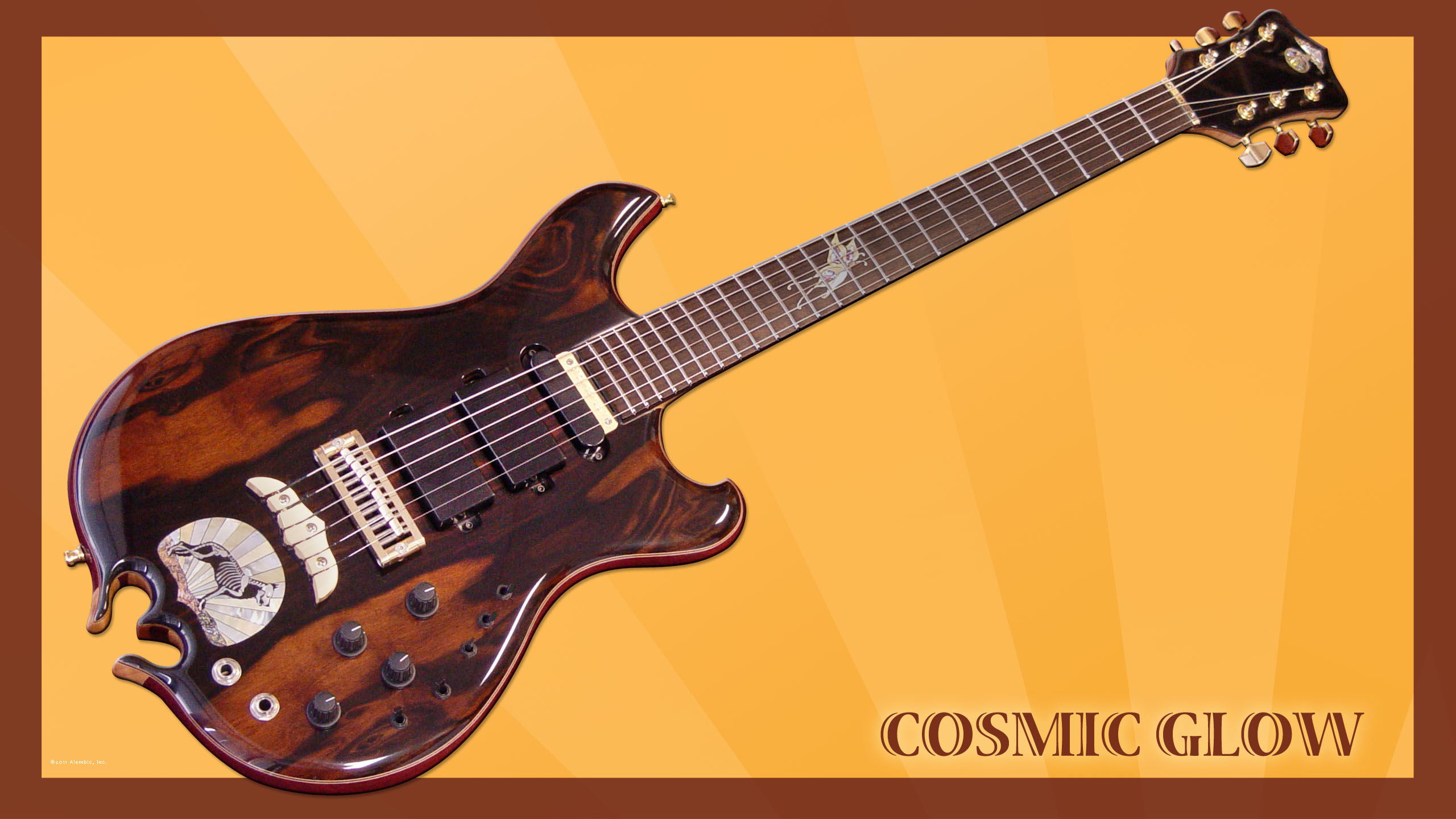 - "Cosmo’s spirit" fingerboard inlay in black and gold mother of pearl, abalone, red acrylic and sterling silver