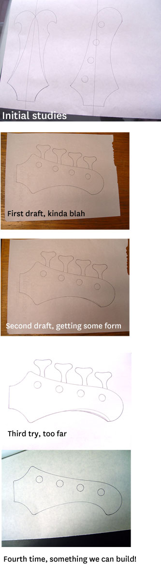 Alan requested a custom peghead shape, based on the Dragon Claw peghead on the instrument he already had. It’s never quite as easy as the request sounds, "take the ’claw’ part off" because you have to study the form and make sure it doesn’t look like you just took the claw part off. In this case, we pulled the center of the peghead over to the left more than the original. A few sketches later, and we had the shape that Alan was dreaming about.