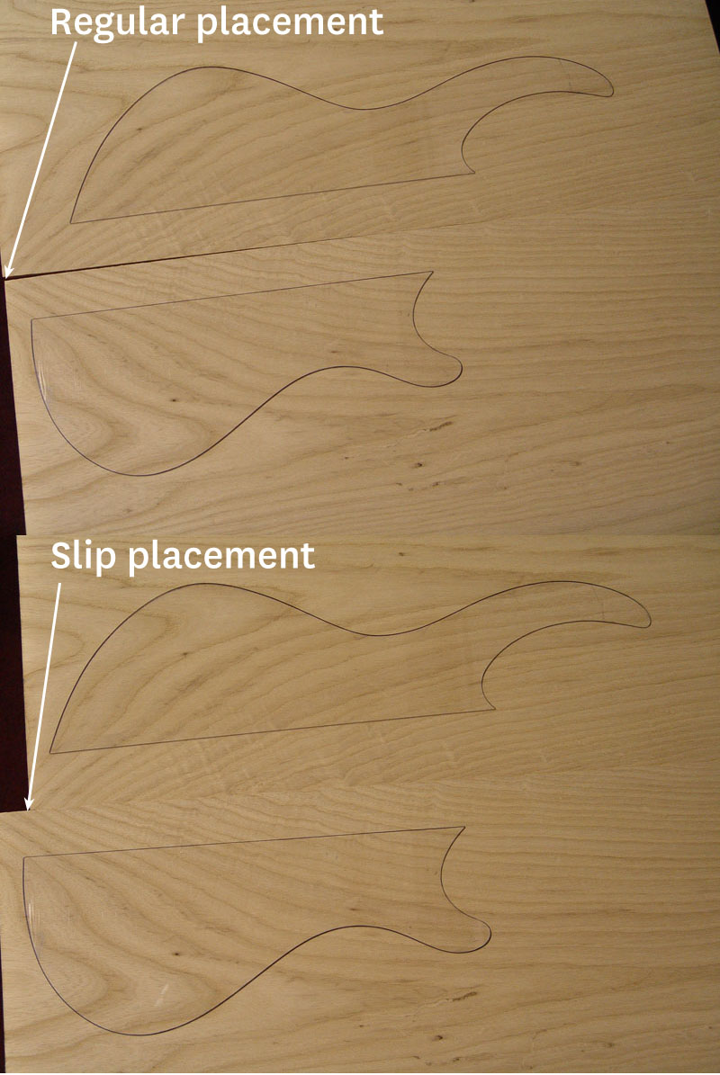 Alan liked the grain he found on another maker’s bass. After looking at a few selections by email, I realized that one of the reasons he wasn’t super excited about the choices is that the asymmetric body shape of the Rogue was gobbling up a key feature he liked on his reference bass - the wide grain at the bottom end. So I suggested we try slipping the bookmatch to capture more of that wide grain. Alan approved the new slip placement with an enthusiastic, &ldquoLet it rip!!!”