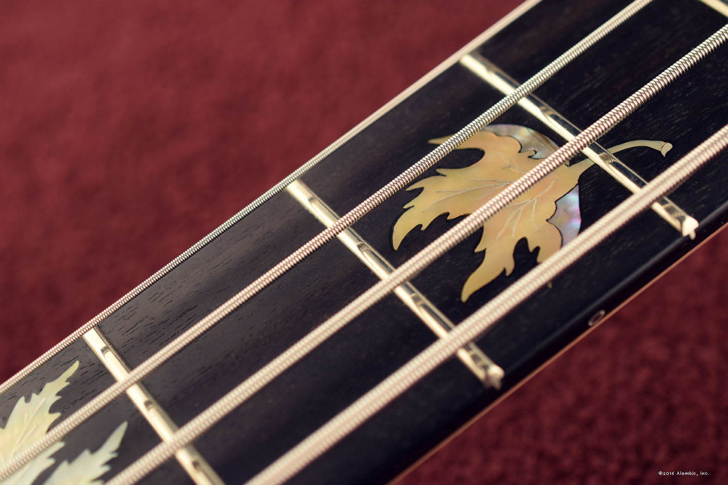 At the 24th fret, we’ve inlaid a Maple seed for a bit of whimsy. The shape is also perfect for the available space. Like the leaves, it is cut from golden mother of pearl and abalone shell.