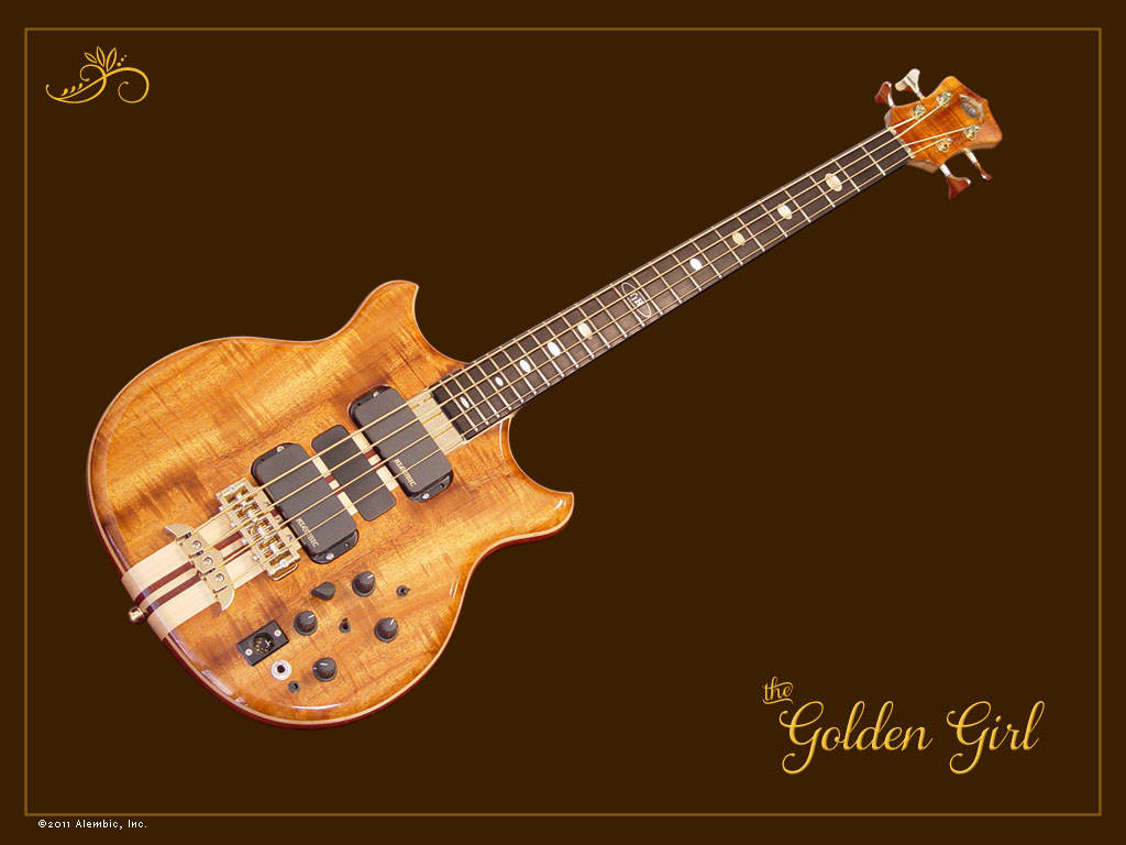Just another touch of gold with the golden mother of pearl cloud in the inlaid Alembic logo. Paired with the polished bronze logo and gorgeous abalone, it’s like a jewel on Golden Girl’s crown peghead.