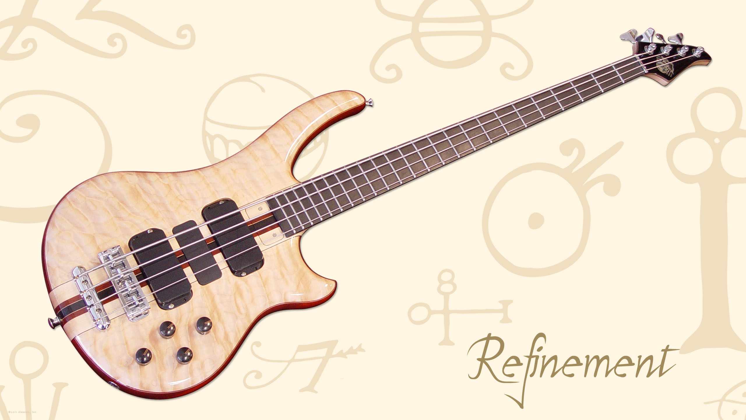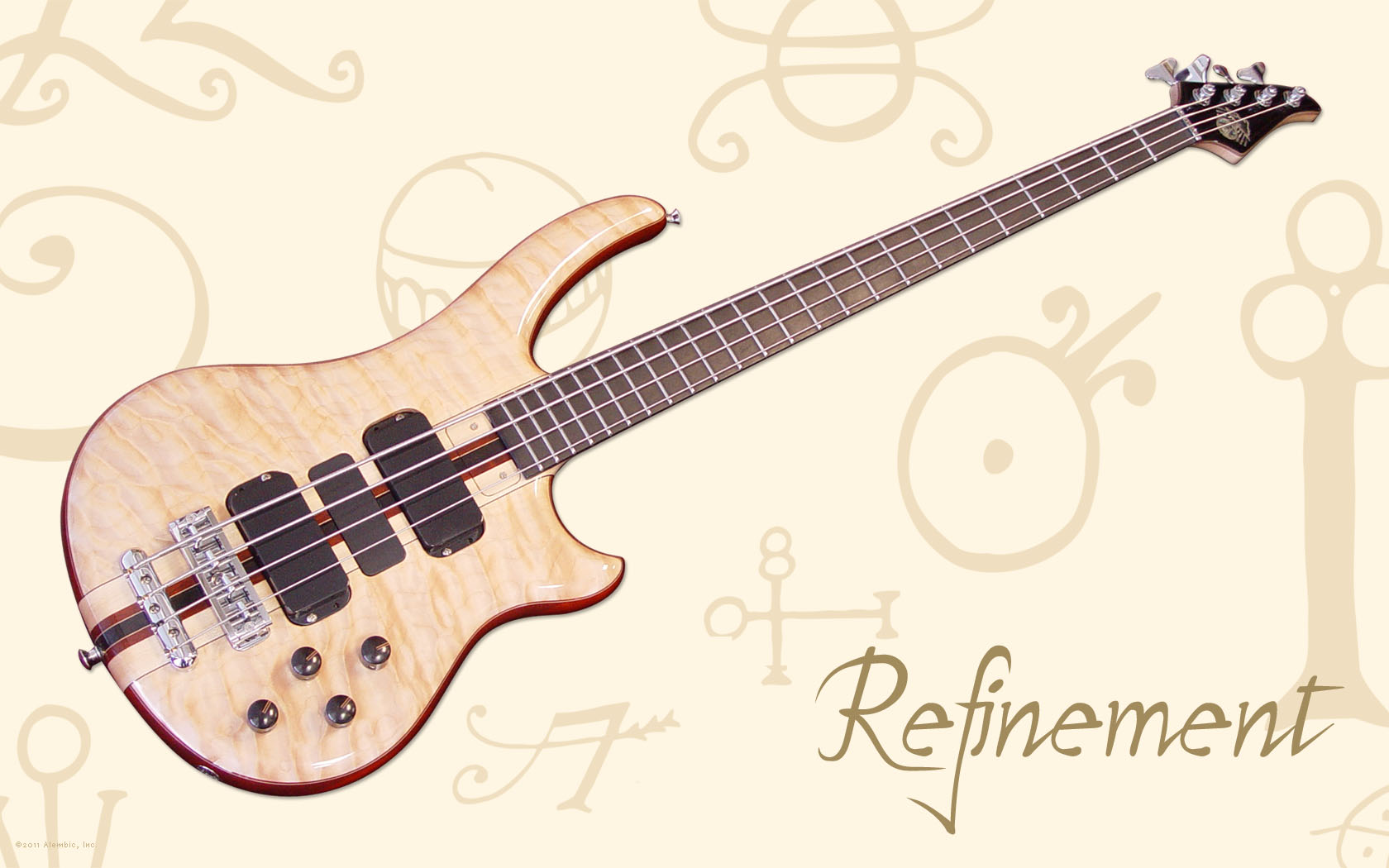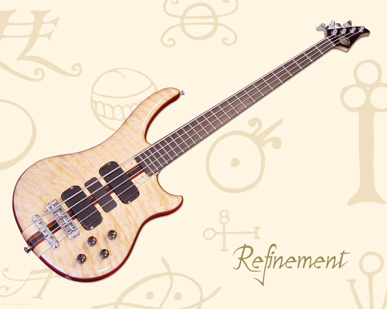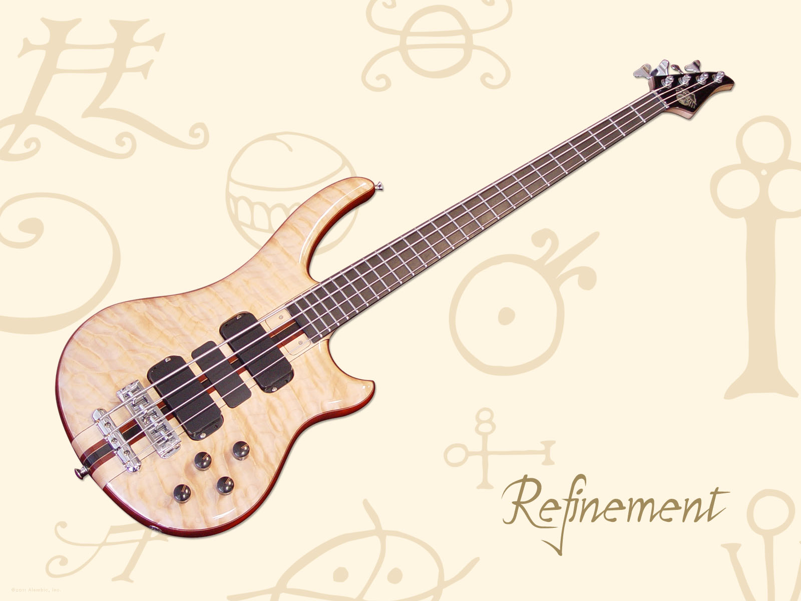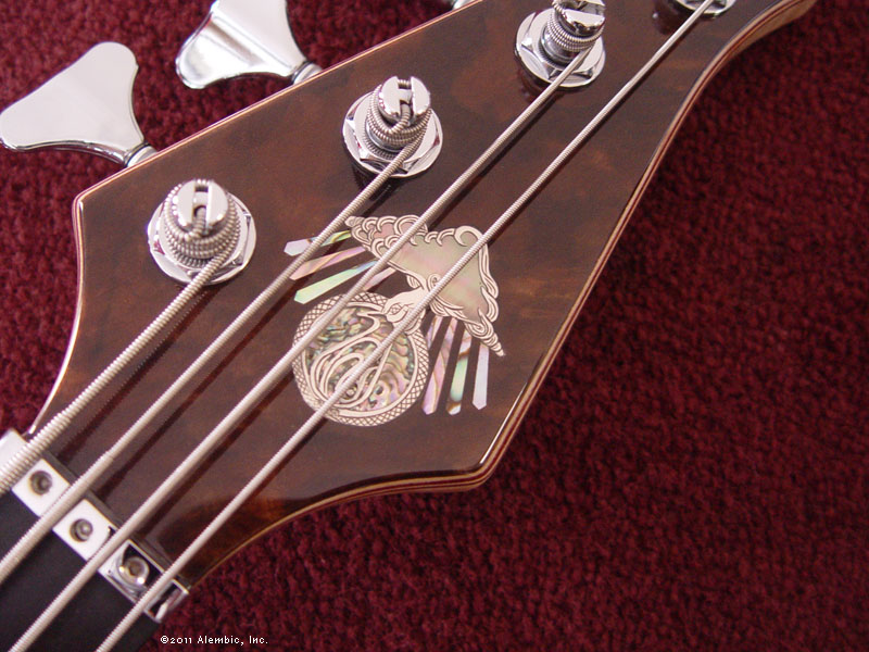 Will chose the inlaid logo with a black Tahitian mother of pearl cloud, abalone rays and circle. Every part of the logo is under the glassy smooth finish Alembics are famous for. The Walnut bass features a similar logo inlay.