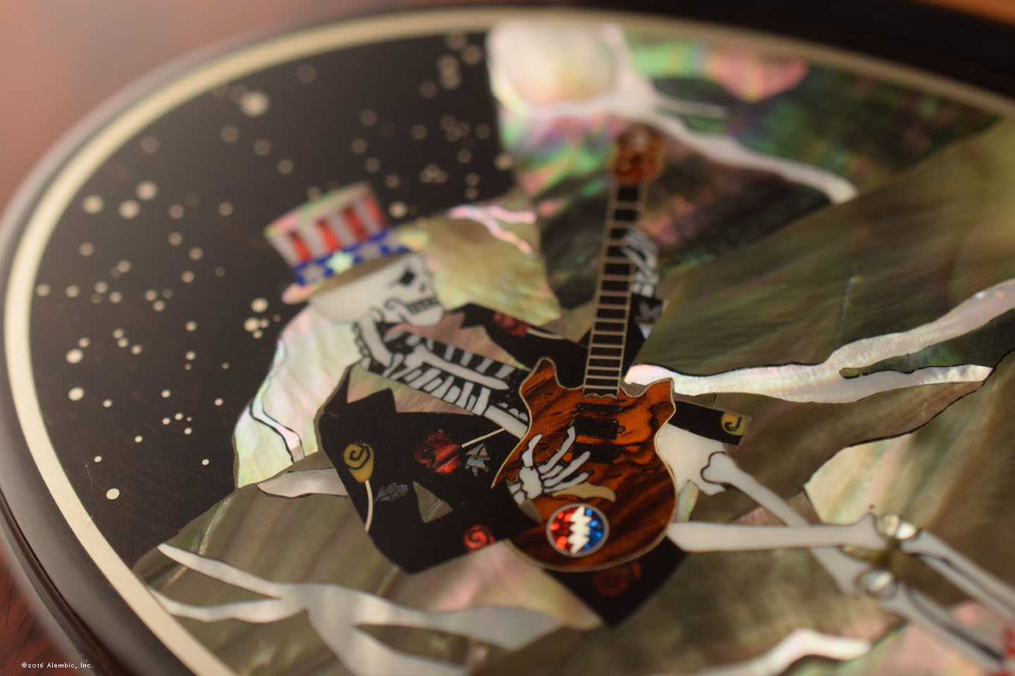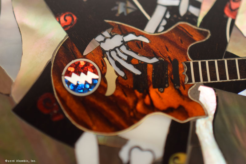 Detail picture of the miniature Tribute guitar with a small simple Stealie medallion inlay and an even smaller simplified Alembic logo inlay. The thin piece of Holly outlining the guitar is a shaving from a handplane. This stuff is small. Kris did a masterful job in bringing Susan’s inlay artwork to life.