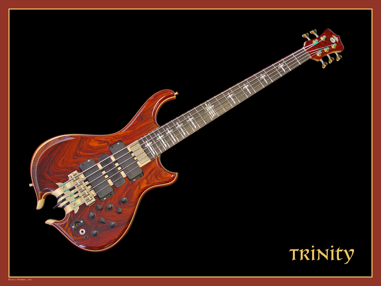 The classic Alembic Crown peghead features Coco Bolo front and back, with the sterling silver logo inlaid beneath the finish featuring particularly beautiful pieces of abalone and mother of pearl. Five strings laid out in a comfort taper are stretched over three ebony neck laminates and Series II electronics to produce fundamentals and sustain that rival a pipe organ in a cathedral.